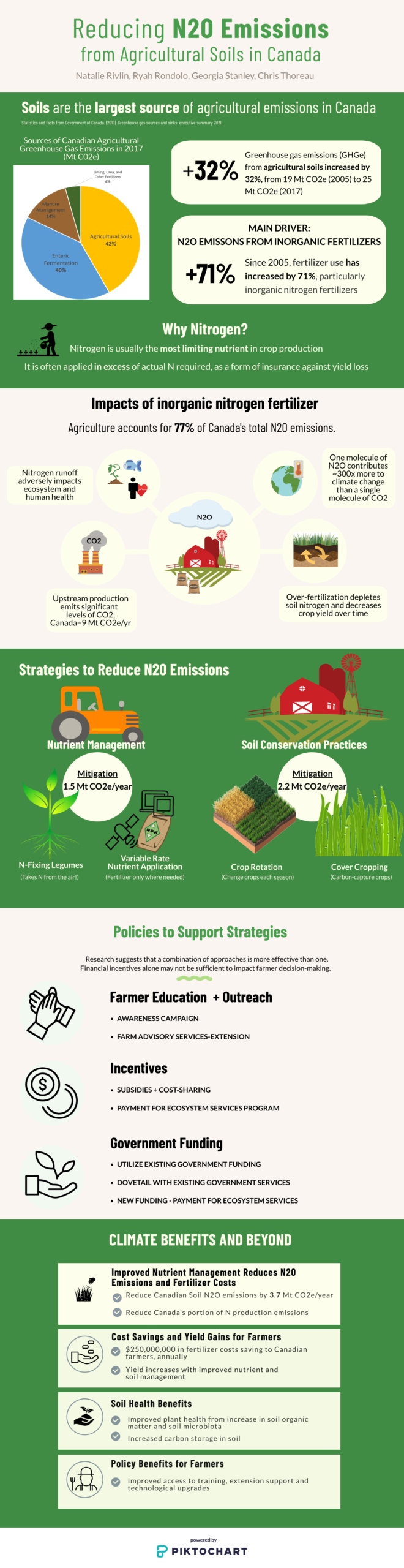 While the soil GHG emissions reductions gained in this approach may seem low as a percentage of Canada’s total emissions, by addressing soil N2O concerns, the numerous complementary benefits that arise speak strongly in support of this approach to not only lessen Canada’s impact on the climate but also improve the health of our agricultural system.